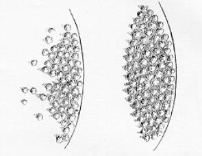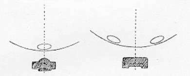 | Figura 10. Desenho mostrando a borda do maciço recortada (desenho à esquerda) e arredondada (desenho à direita). Fonte: Bellair & Bellair (1939). |