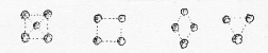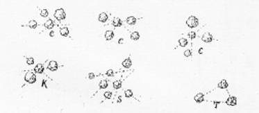 | Figura 11. Desenhos mostrando as várias maneiras de distribuir regularmente as árvores. Fonte: Bellair & Bellair (1939). | Figura 12. Desenhos mostrando as várias maneiras de distribuir irregularmente as árvores, onde: T, para 3 árvores; K, para 4; C, para 5 e S, para 7. Fonte: Bellair & Bellair (1939) |